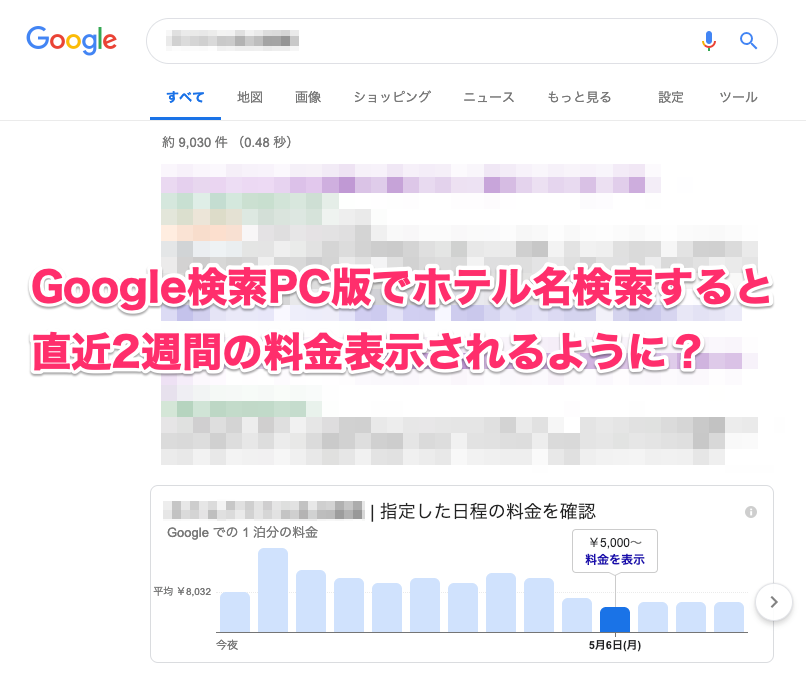 加速が止まらないGoogle広告のホテル宿泊料金表示「Price Insight」。先日からPC版でも、ホテル名で検索すると、Google広告の下側に2ヶ月先までの最低料金が表示されるようになりました。